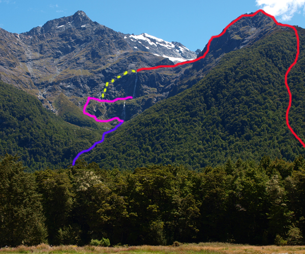 Encore un échec de l’ouverture des « Brida Veil Falls ». C’est décidément incroyablement dur d’accéder au sommet de ces cascades. J’espère que la prochaine sera la bonne. On s’était pourtant donné les moyens. Départ de Queenstown à 2h du matin et départ de la cabane de Routeburn à 3h30. Ensuite, environ 8h de marche dans le Bush pour gagner une altitude 1513m. Impossible de continuer pour atteindre l’autre petit sommet.